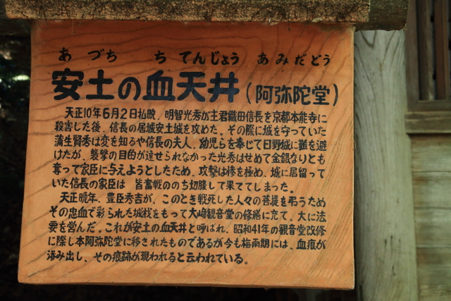大崎寺は、戦国時代には39もの僧坊を持つ大寺院でしたが、度重なる戦乱で荒廃してしまいました。現在残る建物は、江戸時代以降に再建されたものです。中でも、安土城の落城時についたとされる血痕が残る阿弥陀堂の「安土の血天井」は、歴史の重みを感じさせる貴重な遺構です。